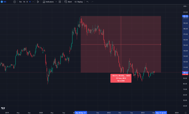 Disney si trova a una distanza del 50% dal picco e si mantiene su un supporto intorno al punto in cui il titolo è sceso nella copertura del 2020.