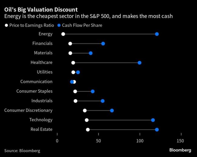 Ieri mi sono imbattuto in questo bel grafico che ci mostra come il settore dell'energia sia il più economico in relazione alla redditività. Inoltre, è quello che genera la maggiore quantità di liquidità. Anche il settore sanitario non sembra male.