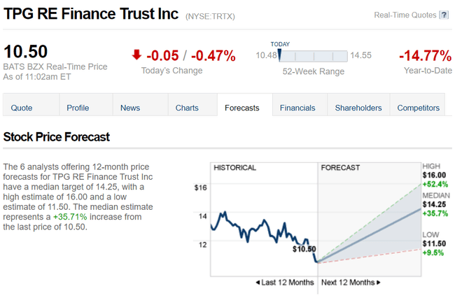 Ecco il commento di un analista: "I proventi delle vendite di asset e altri fattori dovrebbero portare a una modesta crescita dei dividendi in futuro... TRTX dovrebbe anche beneficiare dell'aumento dei tassi nel tempo, soprattutto perché i prestiti fatti nelle condizioni attuali sono debitamente rimborsati". Le azioni di TRTX sono scambiate ad uno sconto rispetto ai colleghi. E l'azienda ha un nuovo amministratore delegato ... che era a capo del debito immobiliare commerciale degli Stati Uniti alla Goldman Sachs". Penso che sia una buona qualifica 😁