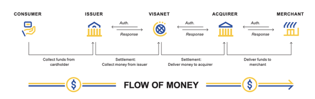 Visa non solo stabilisce le regole per la sua rete, ma agisce anche come attore centrale in tutte le transazioni di pagamento che passano attraverso la rete. Nel suo core business, Visa facilita il movimento di denaro autorizzando le transazioni tra l'emittente e l'acquirente e aiuta anche a spostare i fondi tra le due parti.