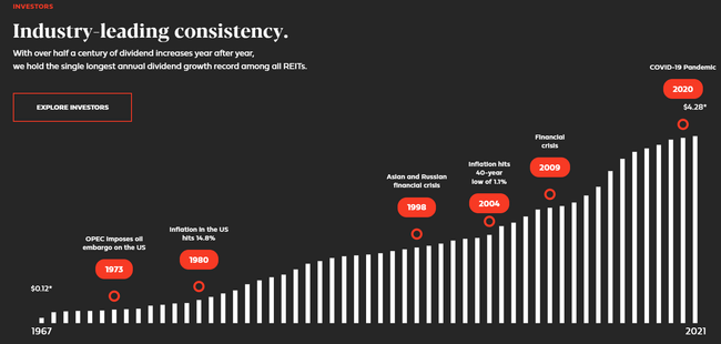 Questo centro commerciale e proprietario di un uso misto è l'unico REIT tra le 39 società che attualmente detengono il titolo di Re dei Dividendi. Ciò significa che sono membri dell'indice S&P 500 che hanno aumentato i loro dividendi per almeno 50 anni di seguito.