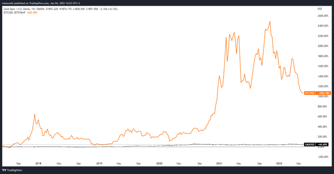 Ma un'analisi più attenta del grafico dell'oro rispetto a quello del bitcoin mostra che, mentre l'oro ha registrato un leggero guadagno del 44,69% negli ultimi cinque anni, il prezzo del bitcoin è salito di ben 1.067,04%.