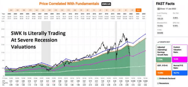 Infatti, nonostante nessun economista di prim'ordine preveda una recessione così grave e severa per l'anno prossimo o per il 2024, $SWK sta già scambiando a valutazioni che vediamo solo in caso di gravi recessioni del mercato orso.