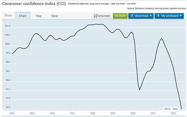 i consumatori spendono di più, il sentimento generale è diminuito. La fiducia dei consumatori negli Stati Uniti è ora la più bassa dal febbraio del 21° secolo. La maggior parte di questo dato può essere attribuito all'inflazione. Dopo tutto, l'aumento dell'inflazione si manifesta negli acquisti di tutti i giorni, come la benzina e la spesa, e quasi tutti ne sentono il peso.