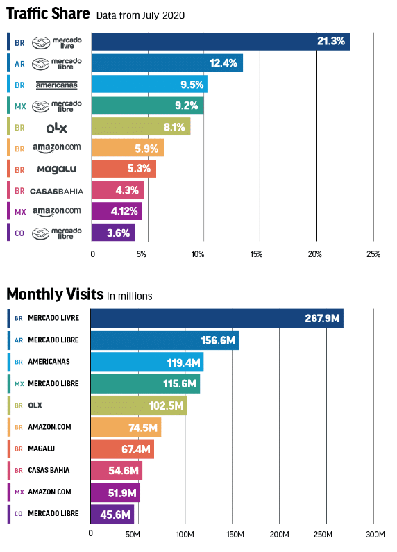 Per avere un'idea del grado di monopolio che l'azienda detiene nel mercato latino-americano, possiamo osservare i grafici seguenti. I dati risalgono al 2020. Nel primo grafico, vediamo le quote di traffico. In Brasile, MercadoLibre detiene immediatamente una quota del 21,3%, mentre in Argentina è al secondo posto con il 12,4%. Queste quote sono ancora riportate nel secondo grafico in termini di visite mensili.