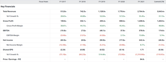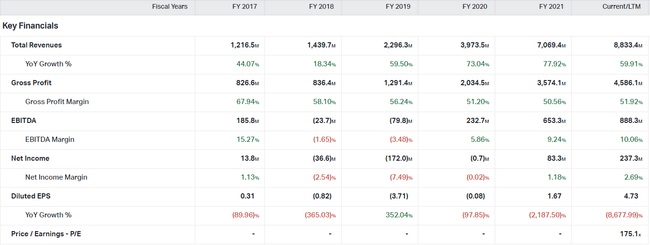 Possiamo osservare un'ottima tendenza all'aumento delle vendite. L'anno scorso, l'azienda ha guadagnato un totale di 7,069 miliardi di dollari, con un miglioramento del 77,92% rispetto all'anno precedente. In media, le vendite sono cresciute del 54,57% rispetto all'anno precedente. L'anno scorso, l'azienda ha guadagnato un profitto lordo di 4,568 miliardi di dollari, che rappresenta un margine lordo del 50,56%. Qui, al contrario, vediamo una tendenza al ribasso del margine lordo. Pertanto, i ricavi dell'azienda stanno crescendo in modo significativo, ma anche i costi. L'anno scorso, per la prima volta dal 2017, l'azienda ha registrato un utile di 83,3 milioni di dollari. Inoltre, si prevede che l'utile possa ancora crescere in modo significativo per quest'anno.