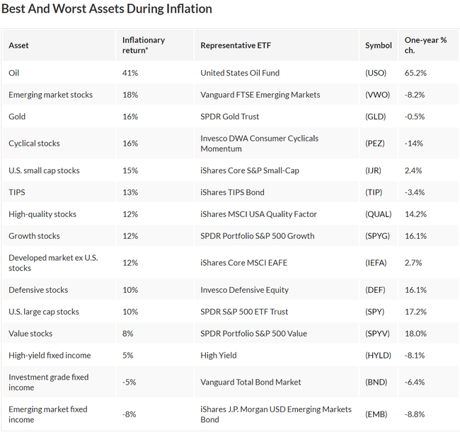 In poche parole: l 'inflazione è favorevole al petrolio e ai titolidei mercati emergenti. E le azioni in generale hanno fatto bene durante i periodi di inflazione crescente. Per la maggior parte dei tipi di obbligazioni, tuttavia, siate preparati a perdite quando l'inflazione aumenta. Questo è un buon promemoria per non premere automaticamente il pulsante di vendita sui titoli dello S&P 500 non appena c'è anche solo un accenno di inflazione.