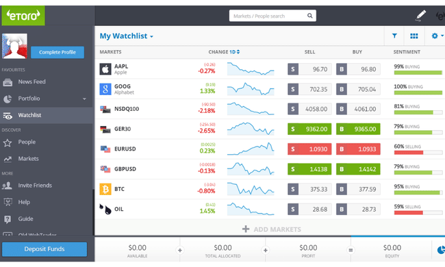 Inoltre, eToro offre un conto demo per i principianti e una piattaforma semplice e facile da capire dove tutto è facile da trovare e scoprire. C'è anche la possibilità di copiare fondi o investitori specifici, quindi ci sono anche i cosiddetti gruppi di copia di portafoglio e investitori pro che offrono ispirazione.