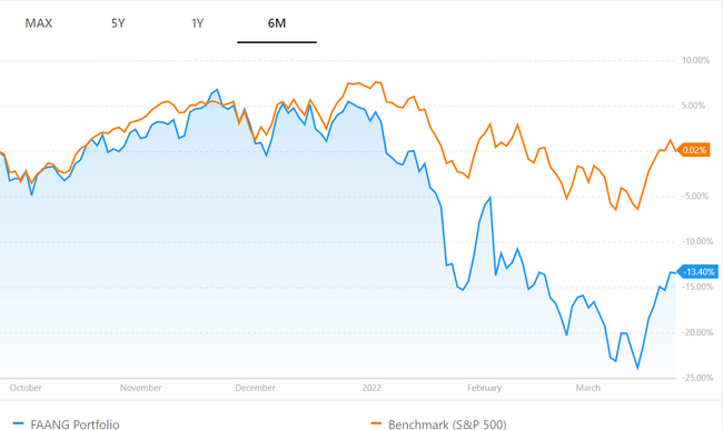 FAANG include classicamente Facebook $FB, Amazon.com $AMZN, Apple $AAPL, Netflix $NFLX e Google $GOOG. Ma a differenza dei periodi precedenti, queste aziende hanno lottato quest'anno grazie all'aumento dei tassi d'interesse. Nel caso di Facebook e Netflix, anche a causa di un crollo della domanda.