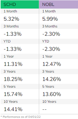 L'ETF ha il peso maggiore in tre settori, vale a dire beni di prima necessità, industriali e materiali. Al 28 febbraio, ha 65 partecipazioni, la più grande delle quali è Manufacturing Company A. O. Smith $AOS, la società farmaceutica Abbvie $ABBV, il produttore di spezie e condimenti McCormick $MKC, il fornitore industriale W.W. Grainger $GWW e Hormel Foods $HRL.